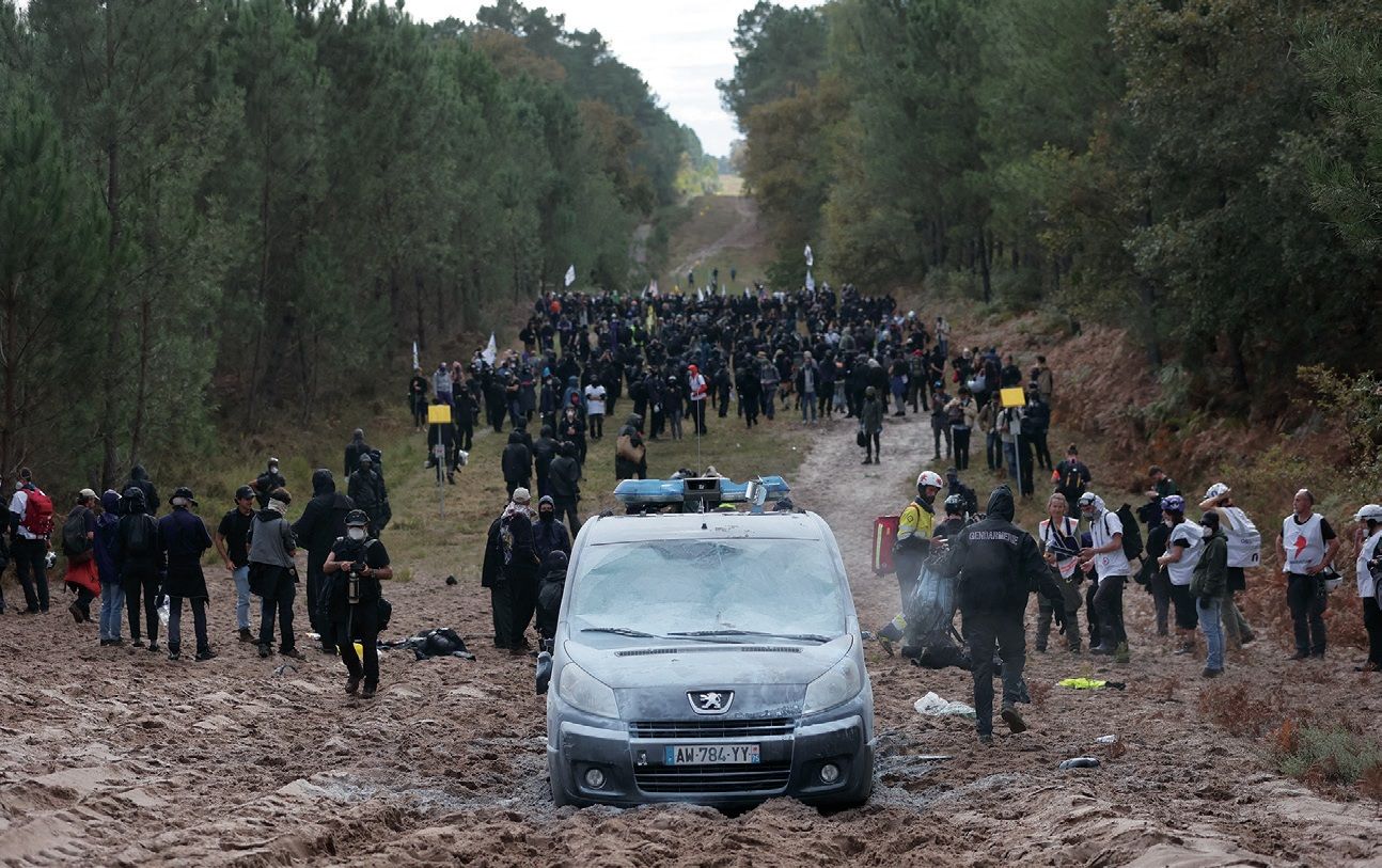 “西南新线”高铁项目此前激起众多争议。图为2024年10月12日,环保组织的示威者在勒尔姆-穆塞附近同宪兵对峙。法新社图