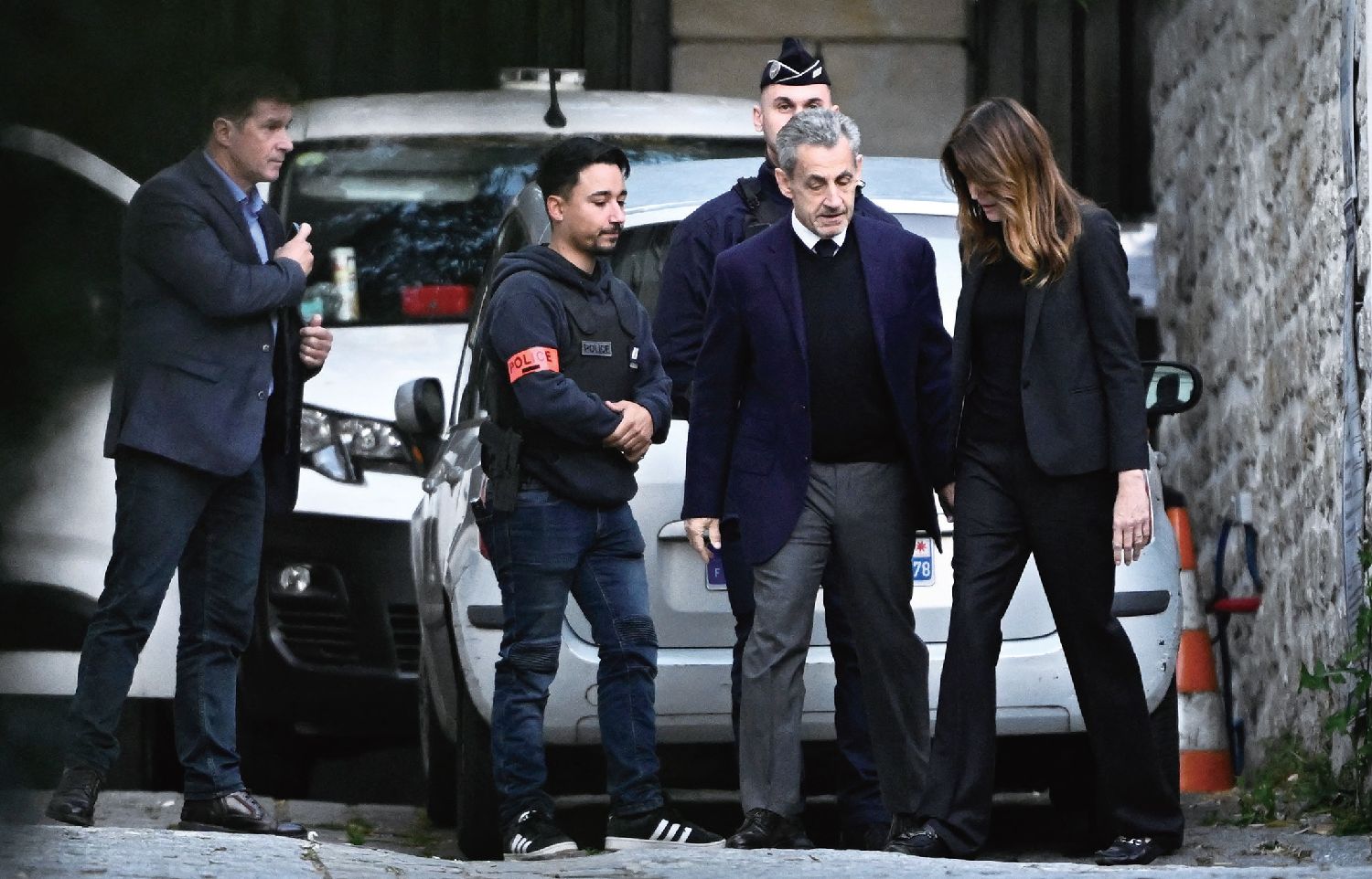 图为萨科奇(中)在妻子卡拉·布鲁尼陪同下,由警员押送离开住所,前往监狱服刑。法新社图