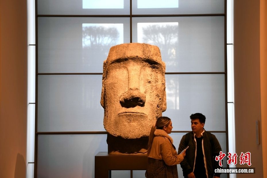 图为来自太平洋岛屿复活节岛的一尊摩艾石像在“五洲艺廊”展出。