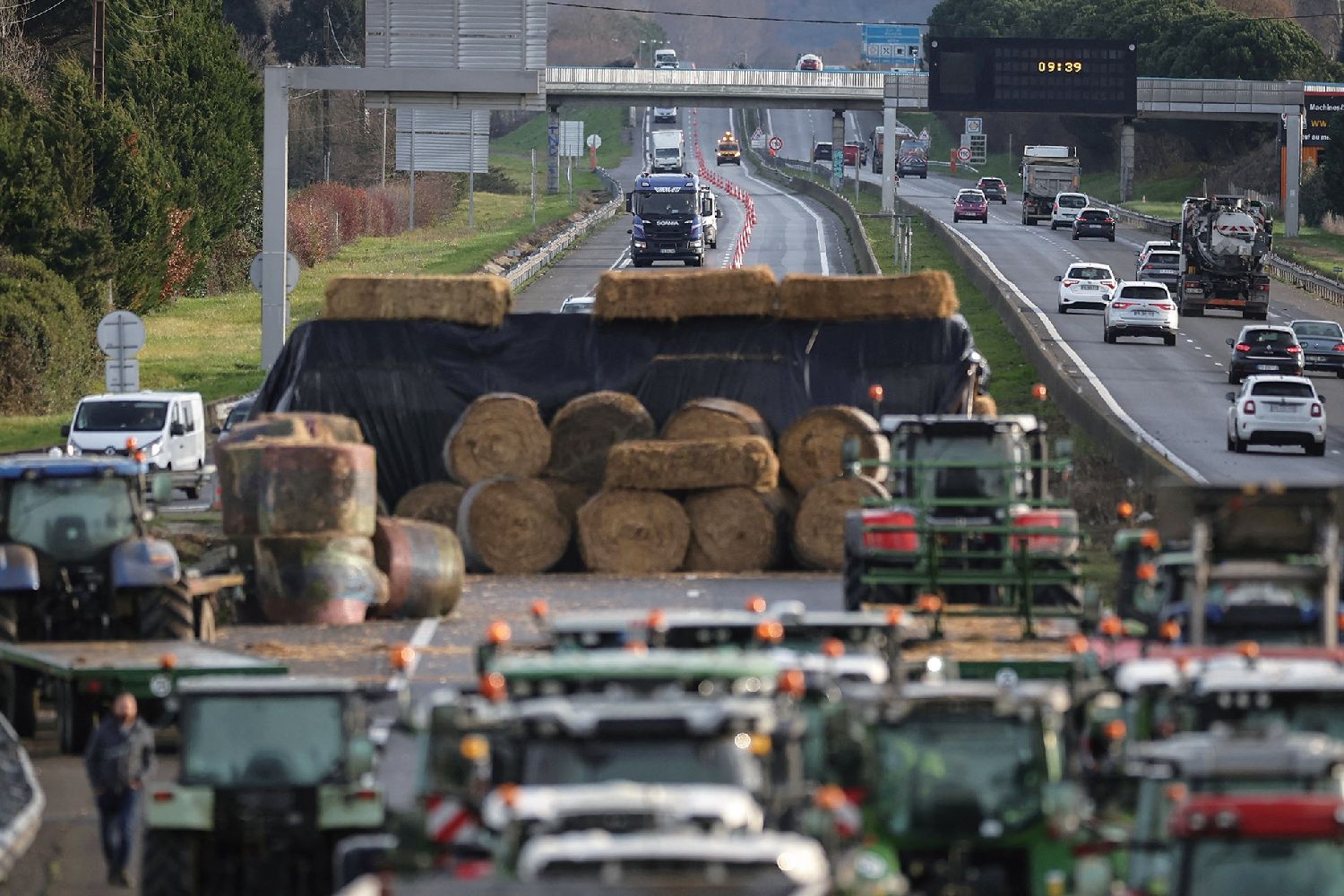 图为12月15日在法国西南部城市Carbonne,抗议防疫措施的农民封锁了A64高速公路。法新社图