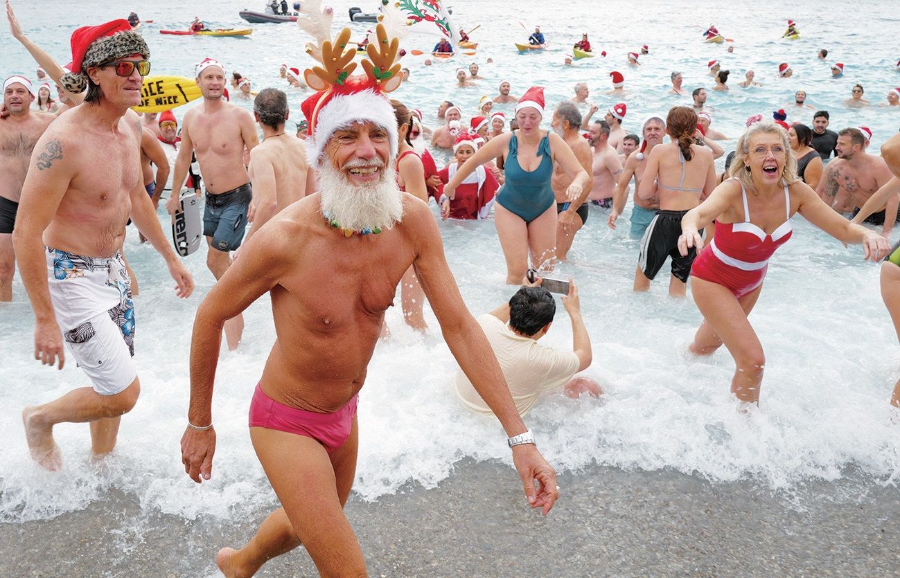 12月21日,法国尼斯举行传统的圣诞浴活动,游客们有的装扮成圣诞老人,有的戴着圣诞帽的游客一起下海游泳,庆祝圣诞节的到来。法新社图