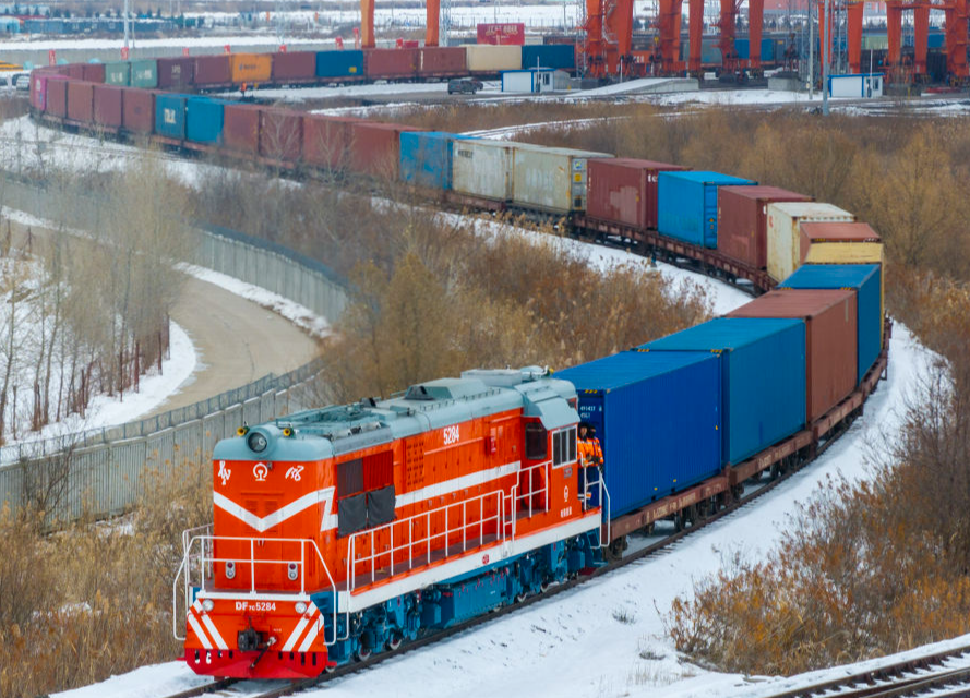 11月16日,一列中欧班列驶出中国铁路哈尔滨局集团有限公司同江北站换装场(无人机照片)。新华社发(吴雨南摄)