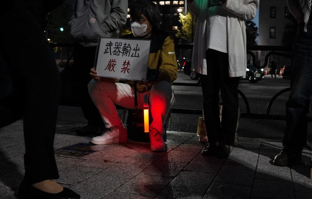 2026年4月16日,在位于日本东京的首相官邸前,抗议者手持标语参加集会,抗议高市政府企图解禁杀伤性武器出口。(图/新华社)