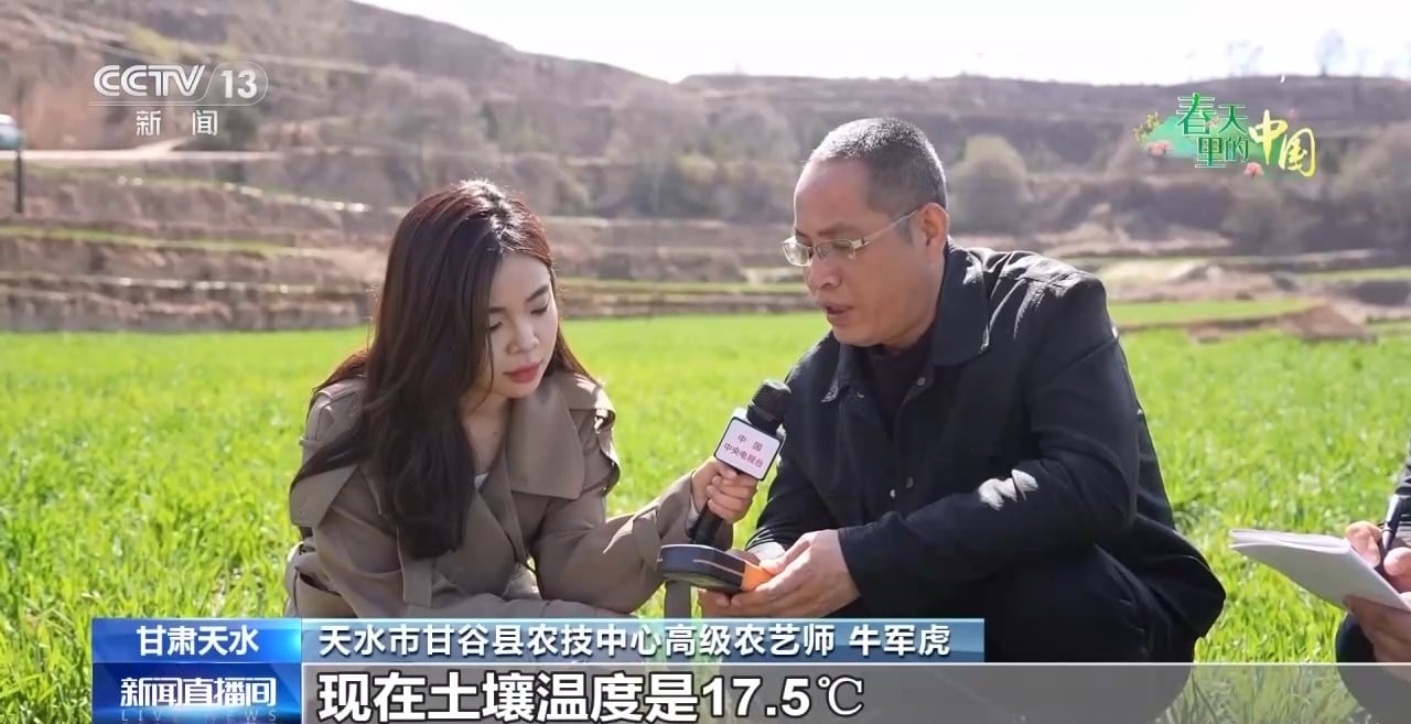 天水市甘谷县农技中心高级农艺师 牛军虎:现在土壤温度是17.5℃,湿度是81%,适合冬小麦的生长。