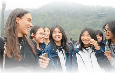 考察团成员梅里顿(左一)在都江堰景区与当地学生交谈。