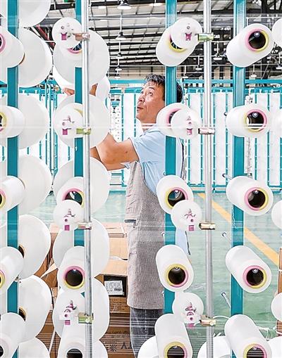 工人在毕节宏盛纺织科技有限公司纺织车间作业。