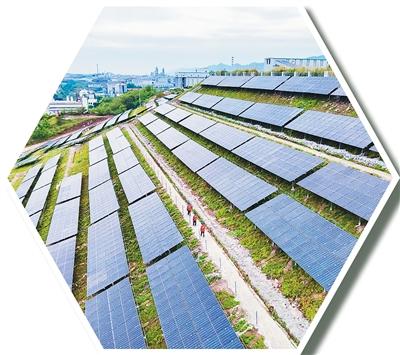 重庆市长寿区鼓励企业利用荒山荒坡、厂房屋顶等空间,发展光伏发电产业项目。图为4月1日,在当地一家公司周围边坡,国家电网重庆长寿供电公司员工在巡检光伏发电设备。