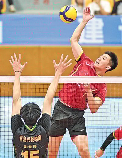 十五运会排球男子成年组小组赛,江苏队选手在比赛中扣球。新华社记者 陈钟昊摄