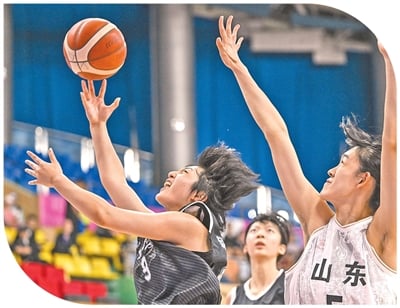 十五运会篮球女子18岁以下组小组赛,重庆队选手(左)在比赛中上篮。新华社记者 丁 磊摄