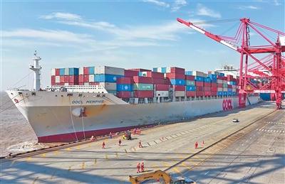 图为靠泊上海洋山港的“钱凯—上海”海运航线船舶。