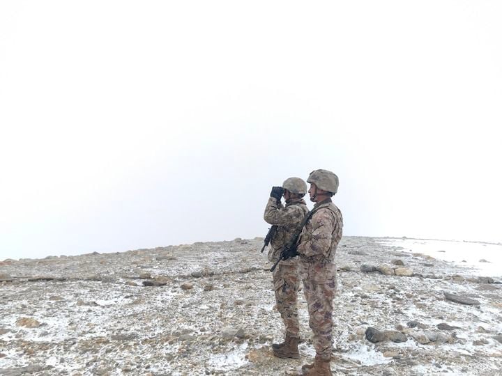 2月15日,西藏军区某边防团5592哨所官兵在观察地形。新华社发(沈杰 摄)