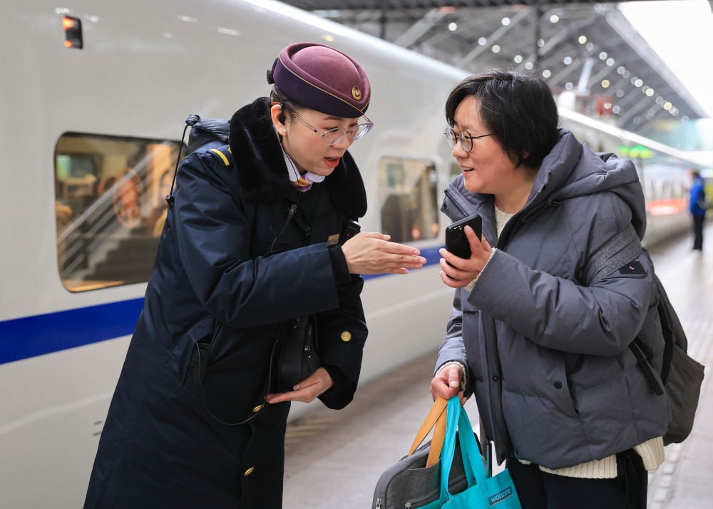 ↑ 2月16日,在南京火车站,乘务人员在站台上解答旅客问询。新华社发(苏阳摄)