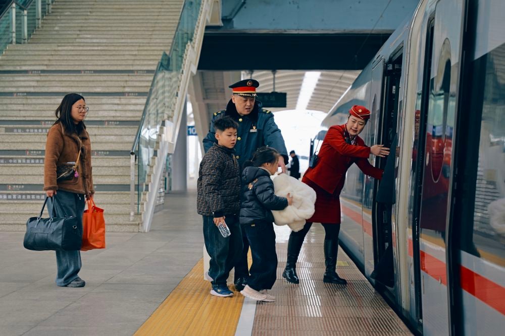 ↑ 2月16日,铁路徐州东站工作人员协助旅客上车。新华社发(张光磊摄)