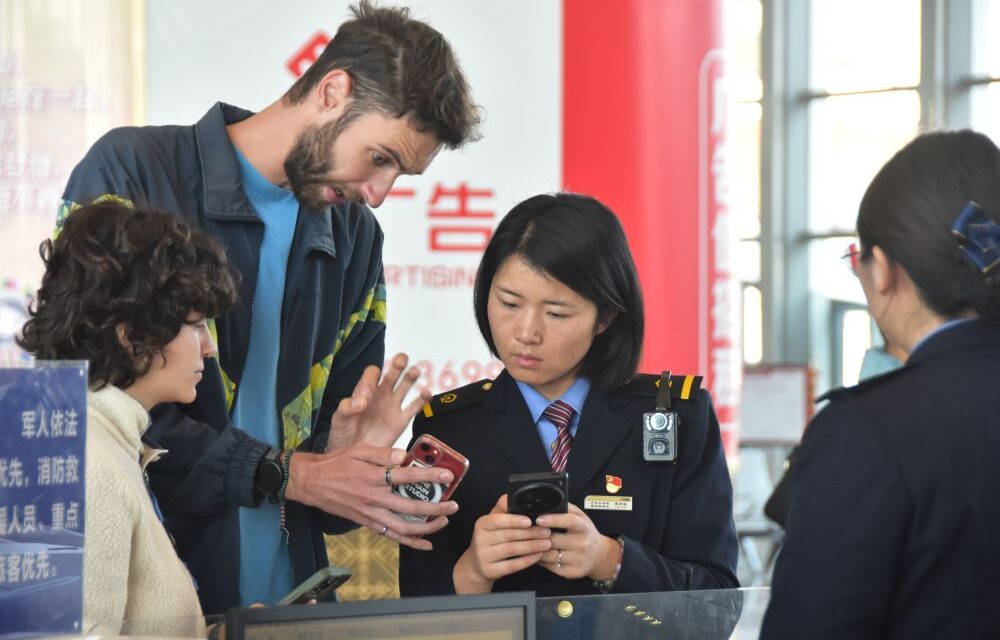 ↑ 2月16日,在云南红河站,铁路工作人员龚岸敏(右二)为旅客提供咨询服务。新华社发(薛莹莹摄)