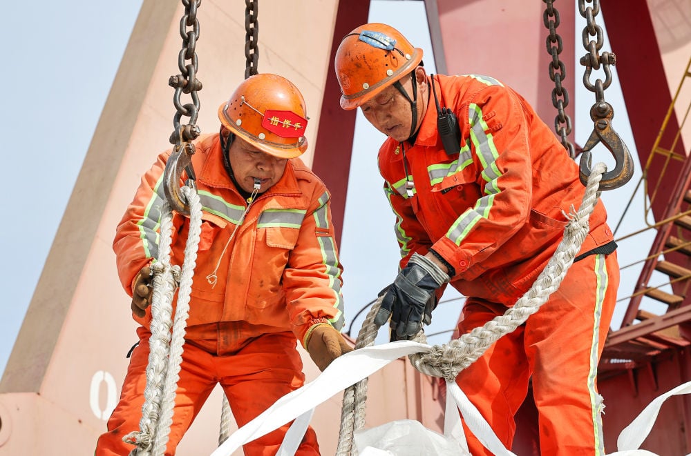 ↑ 2月16日,在江苏连云港港东方港务分公司码头,港口工人为出口货物挂钩,准备吊装。新华社发(王健民摄)