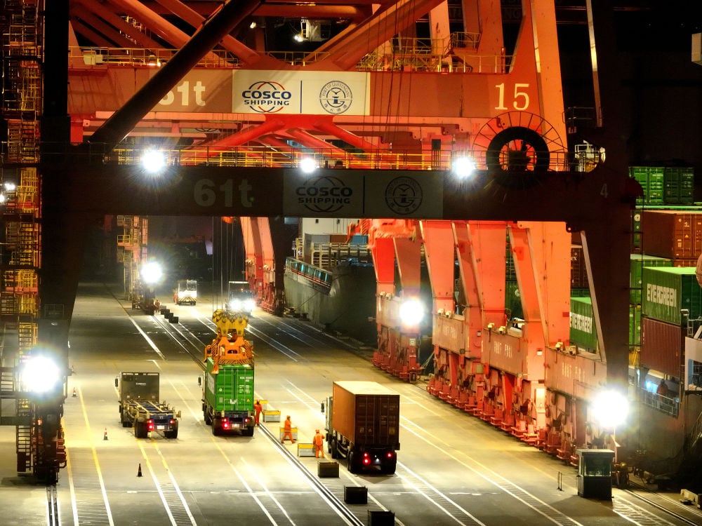 ↑ 2月16日凌晨,江苏省连云港港集装箱码头灯火通明,工作人员在运输、装卸集装箱(无人机照片)。新华社发(王春摄)