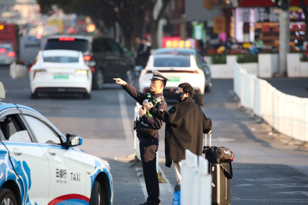 ↑ 2月16日,在云南省昆明市站前路,民警为刚出站的游客指路。新华社发(李云生摄)