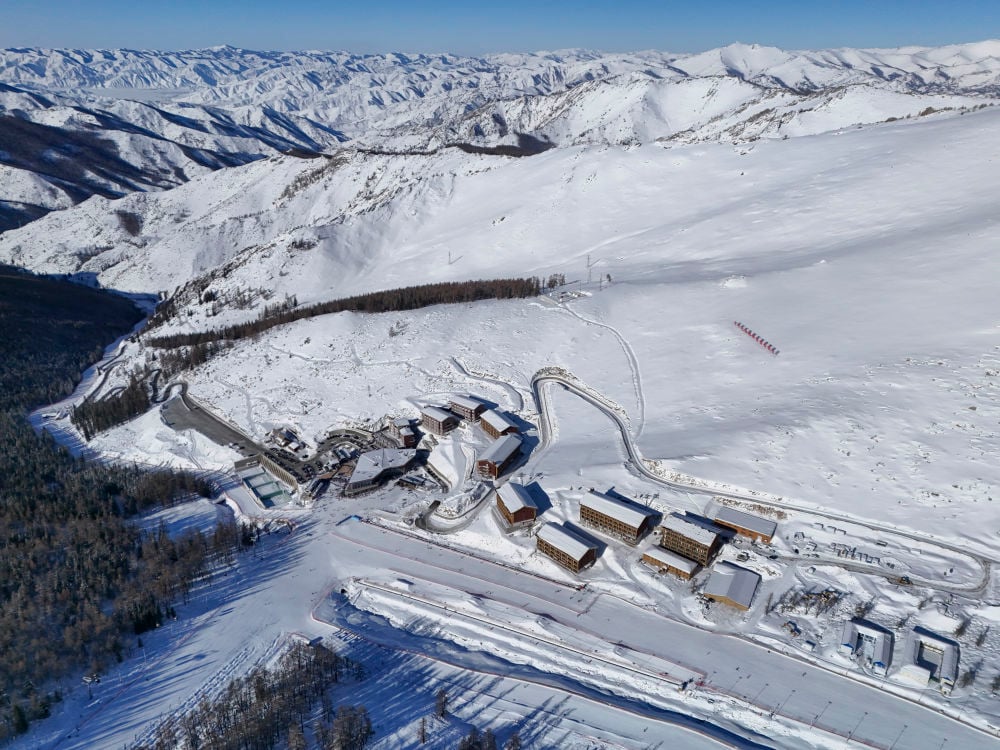 新疆阿勒泰将军山国际滑雪度假区坐落在城区(2025年1月24日摄,无人机照片)。新华社记者 胡虎虎 摄