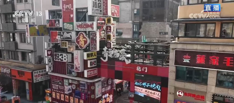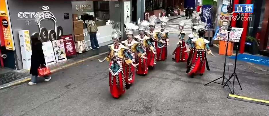 记者来到贵阳市的青云市集,通过航拍镜头可以看到,这里是在贵阳老城区的中心位置。最近几年,贵阳市通过城市更新,把这里改造成了这几年火爆出圈的文旅街区。现在,听见鼓声响起,青云市集为了迎新春而专门打造的“非遗集市”正式开市了,台上正在表演的是贵州省级非物质文化遗产——石阡傩戏。