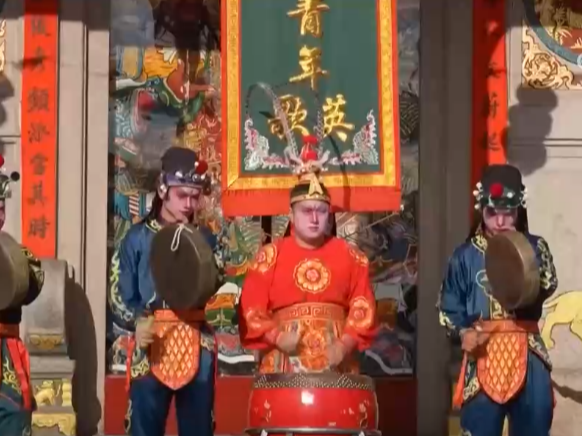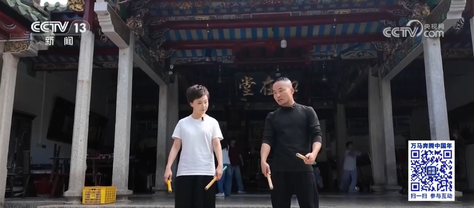 总台记者赵宇昕找到了普宁富美青年英歌队总教练李俊浩,赵宇昕说:“李教练,我是您失散多年的徒弟。我总是看您在英歌舞里面跳关胜那个角色,动作非常的鼓舞人心,今天想特意找您来学一学英歌舞。”