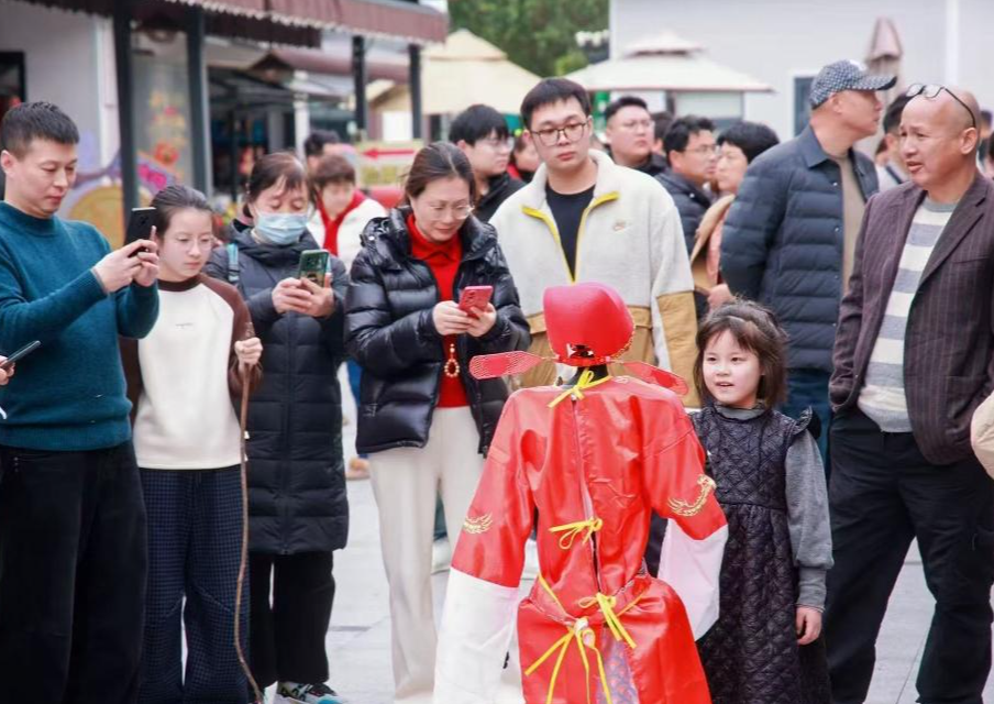 2月19日,杭州文三数字生活街区的机器人在杭州灵山景区“营业”,与市民游客现场互动。(受访者供图)