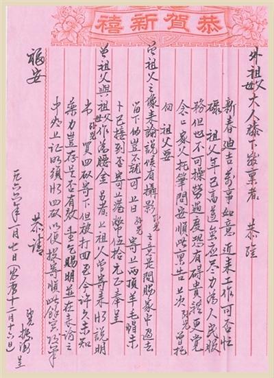 敬禀者,恭维新春迪吉,万事如意,近来工作可否忙碌?祖父年已高迈,虽应尽力为人民服务,但也不可操劳过度,恐有碍贵体,更觉念甚!家父托笔问安,顺此禀告。上次孙儿曾托向祖父要曾祖父之像,来谕说候有摄影。孙儿之意是,问赐家中过去留下的岂不就可。上日孙儿寄上两顶羊毛帽未卜,已接到否?寄上港币伍拾元正,奉呈曾祖父与祖父母作为腰金。另者,上祖父曾寄来H3说明书,孙儿买四罐寄下,但被打(退)回至今许久,未知药力岂存,是否有效,望乞赐明。并在来谕之中,夹上证明须H3四(罐),以便投寄。顺此,余言后禀。