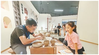 包茂高速广东茂名柏桥服务区开通运营后,吸引众多游客。图为在服务区内的非物质文化遗产展示馆,游客近距离观看非遗技艺。