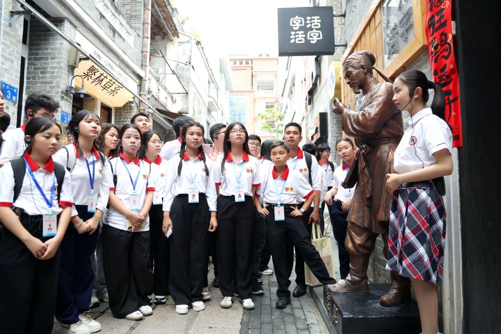 ↑ 4月12日,越南青年“红色研学之旅”之“不忘初心”研学营成员在广州永庆坊了解活字印刷相关知识。