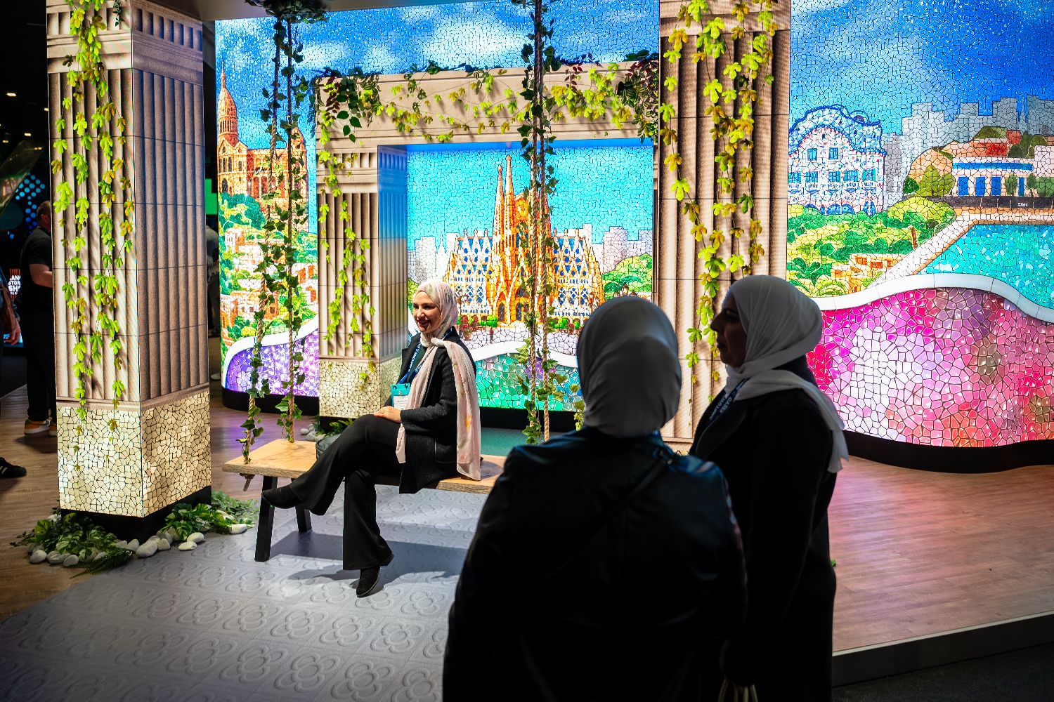 2月3日,在西班牙巴塞罗那,一名女士在LED屏前拍照。