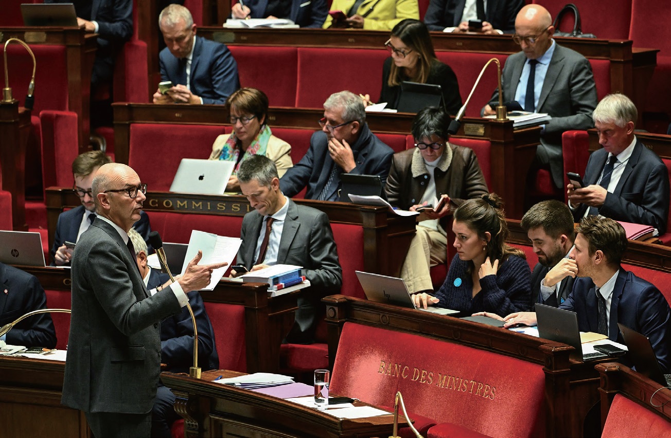 图为法国经济与财政部长莱斯库尔在国民议会审议2026年国家预算案期间,就财政法草案发表讲话。法新社图